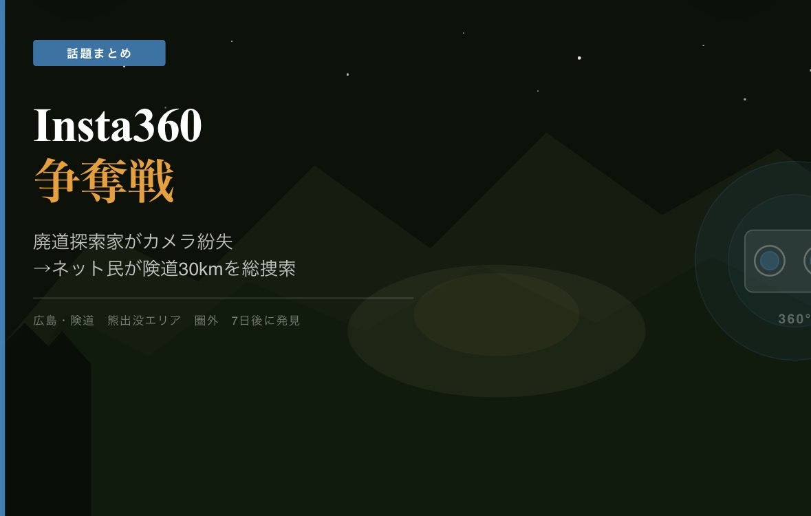 3月20日、廃道探索家・ヨッキれん氏が広島の険道でInsta360 ONE X2を紛失。「見つけた人にそのままあげます」という呼びかけがXで拡散し、バイク乗り・自転車乗りが険道に集結。熊出没エリア・圏外の山中で、ネット民による前代未聞の総力捜索が始まった。